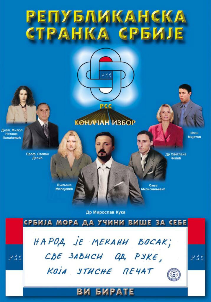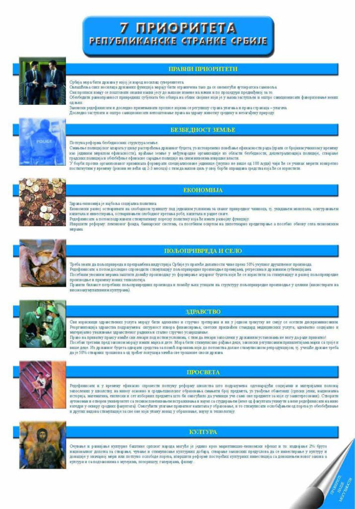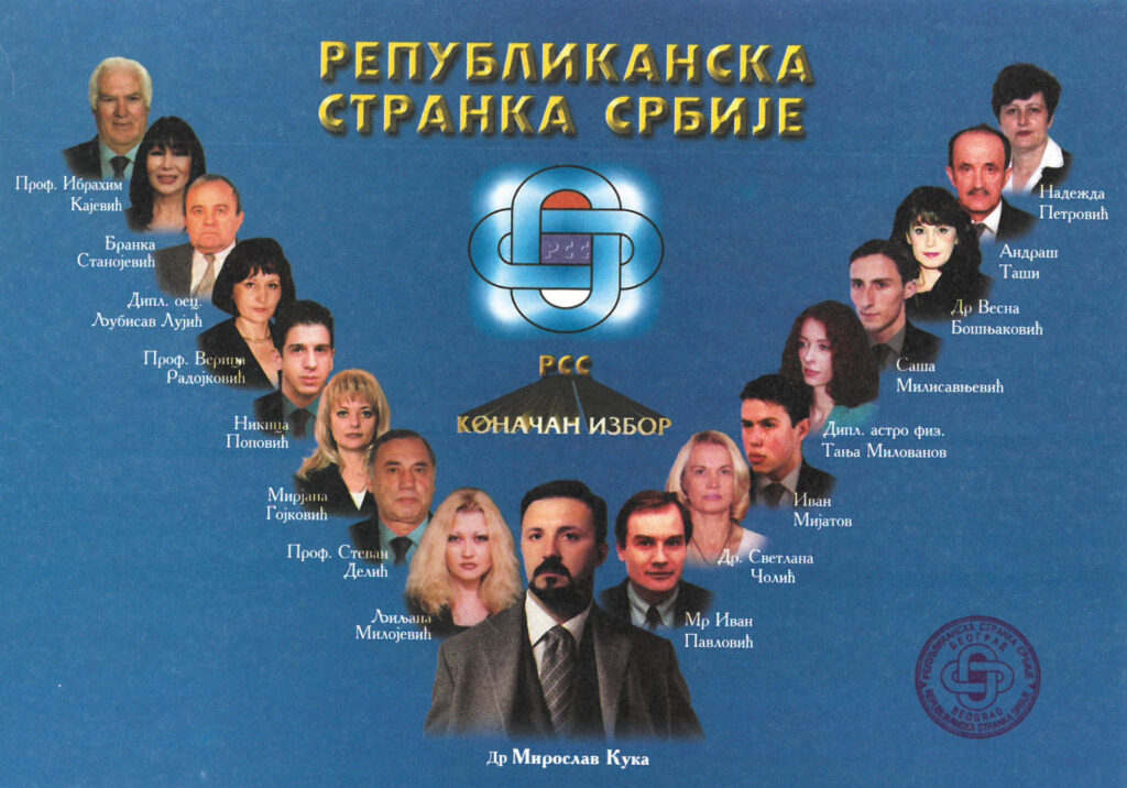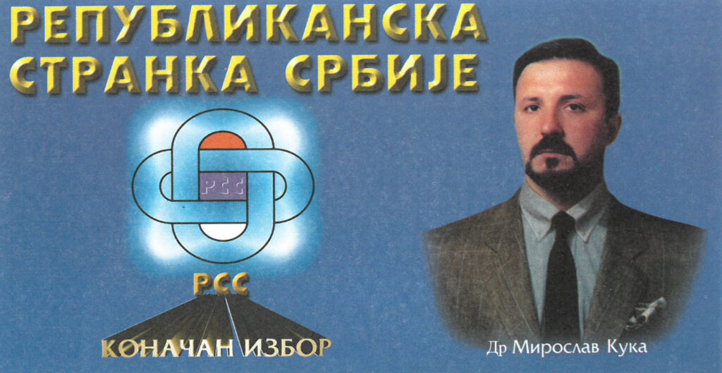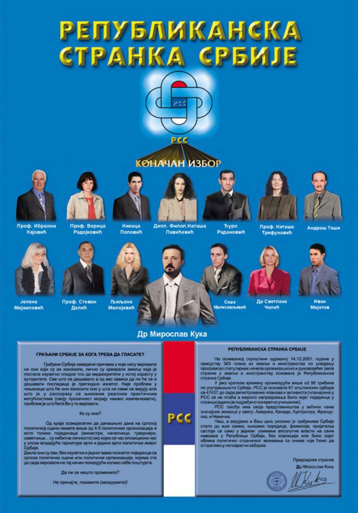 The REPUBLICAN PARTY OF SERBIA (RSS) was founded on December 14, 2001. in Belgrade. At the Constituent Assembly, in the presence of 363 members, the program principles of the party were defined, the party’s statute was adopted, the leadership was elected, three councils (political, legal, economic) were formed and the symbols of the party (symbol and flag) were adopted. Miroslav Kuka was unanimously elected president of RSS. The basic motto of the party is “Only what we renounced is lost”, and the basic programmatic principle of the internal organization and stability of the country is: End of Evasion, Crime, Anarchy. The party was closed on 19.4.2010. year.